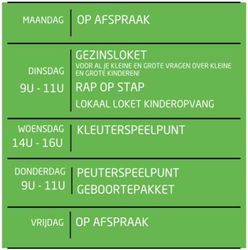 Elke dinsdag kan je zonder afspraak langskomen tussen 9u – 11u tijdens het gezinsloket.